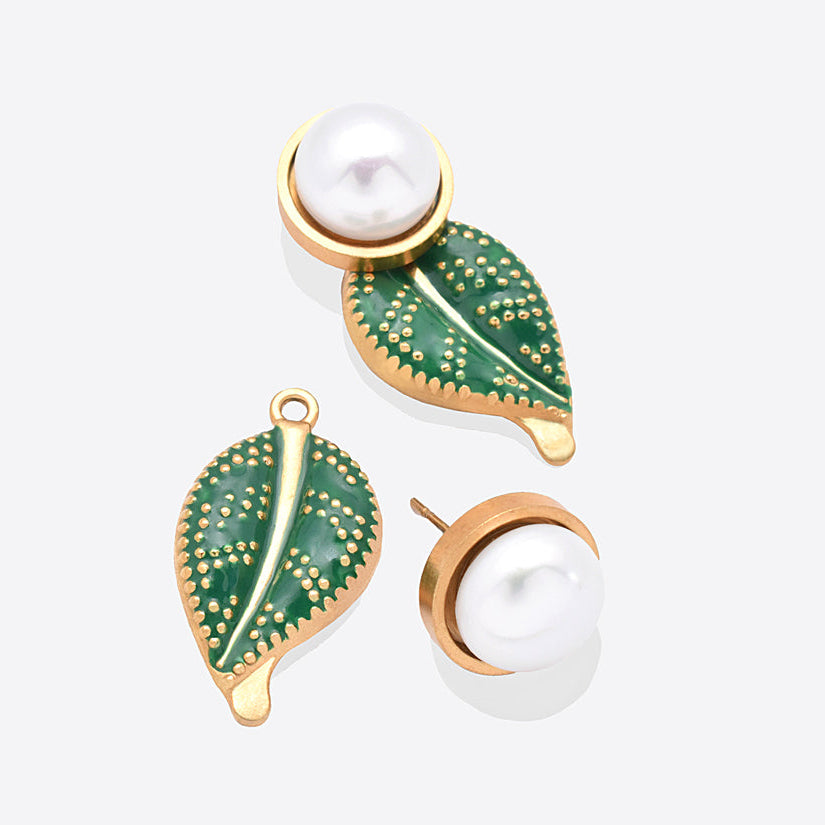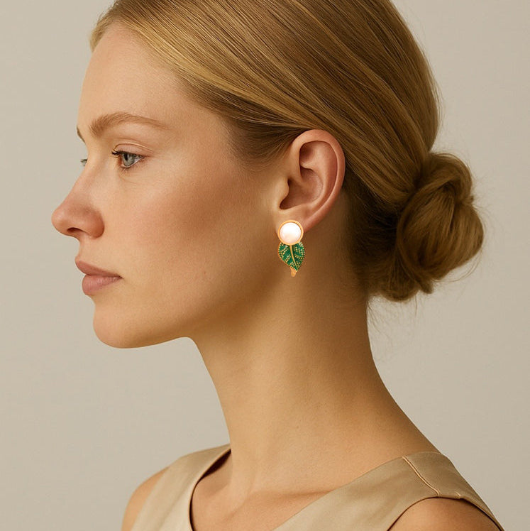 Bladvormige oorbellen in smaragdgroen met zoetwaterparels en van hypo-allergeen RVS. Draag ze op twee manieren: als statement blad-oorbellen of als minimalistische parel oorknopjes. Perfect voor liefhebbers van natuur, originaliteit en tijdloze elegantie.