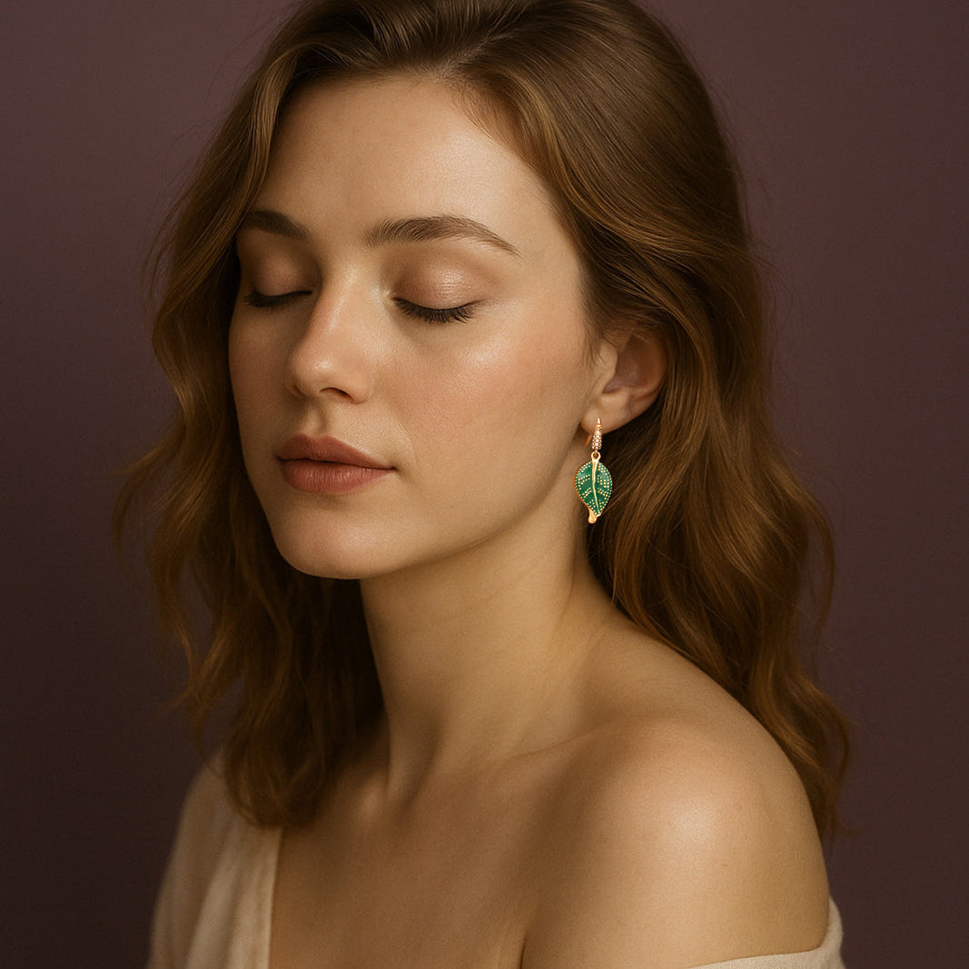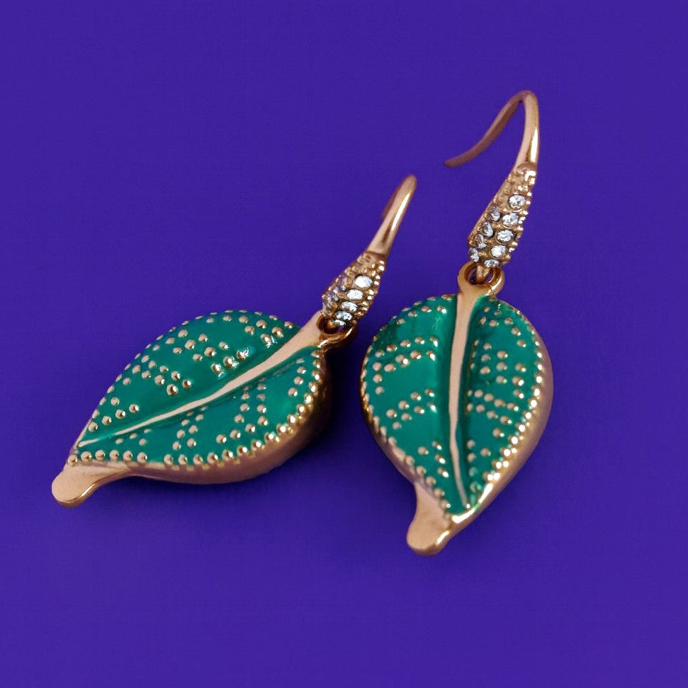 Bladvormige oorbellen in smaragdgroen met vergulde roestvrij staal en Zirkonia details aan het oorhaakje. De Selva Royale straalt natuurlijke elegantie uit en het blad symboliseert groei en vernieuwing. Geïnspireerd op Soemerische koningin PUABI, zijn deze oorbellen een origineel statement dat elke look laat sprankelen.